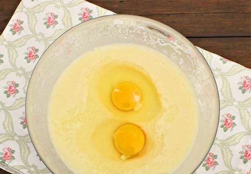 - Voeg vervolgens eieren en suiker toe, roer.