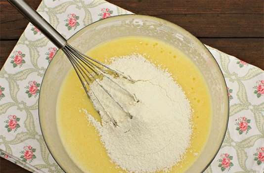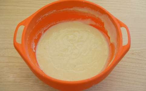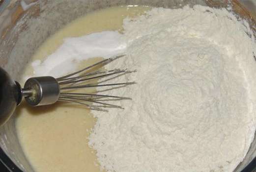 - Meng in een aparte kom bloem, vanillesuiker, bakpoeder en voeg deze ingrediënten toe aan het deeg. Goed mengen.