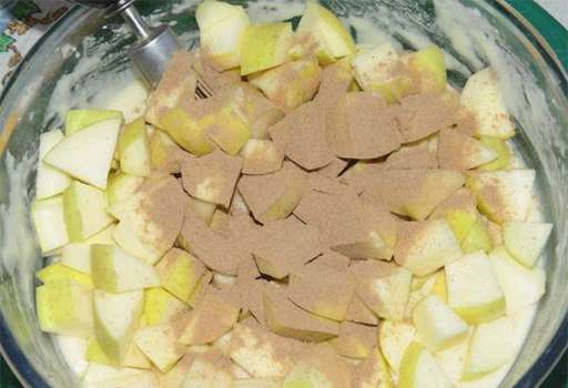 - Was de appels, schil, verwijder het klokhuis met zaden. Snijd de appels in kleine blokjes. Voeg appels en kaneel toe aan het deeg.