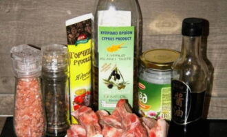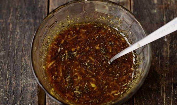 - Nu voegen we alle componenten voor de marinade bij elkaar. Laat u bij het toevoegen van kruiden en smaakmakers alleen leiden door uw eigen smaak en de voorkeuren van uw dierbaren. Het is niet nodig om alles toe te voegen wat bij de ingrediënten staat vermeld.