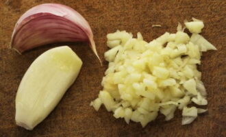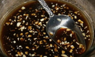 - Voeg de gehakte knoflook toe aan de totale massa en meng voor de laatste keer alle componenten voor de marinade grondig.