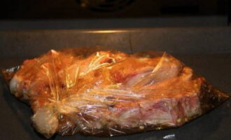 - Breng de gemarineerde ribben over naar de bakvorm, giet de resterende marinade over de ribben en stuur ze naar de voorverwarmde oven om 60 minuten te bakken.