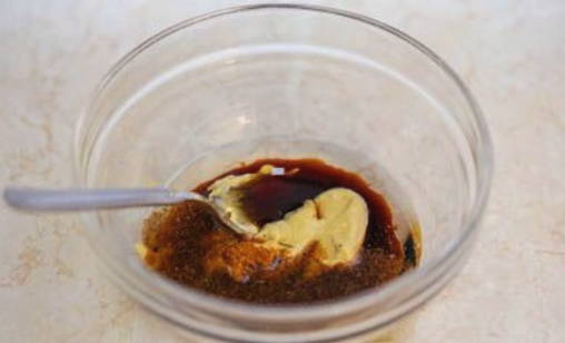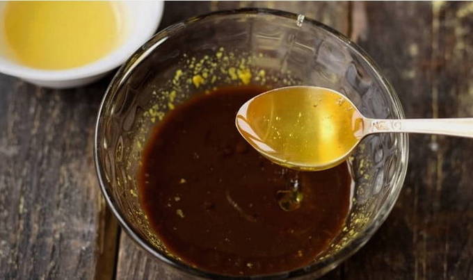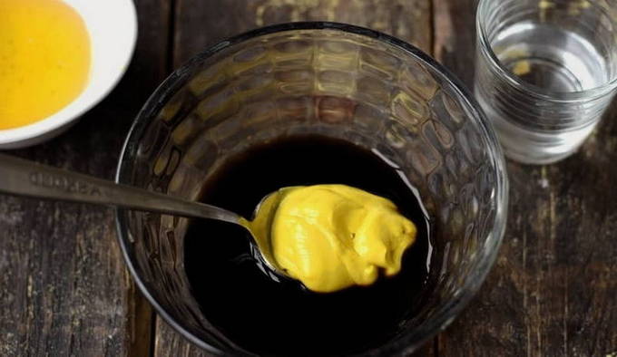 - Voeg vloeibare mosterd toe aan een aparte kom met sojasaus en meng goed.