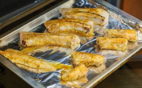 Bij deze kookoptie doen we de ingelegde varkensribbetjes in een bakhuls en sturen ze naar een oven die is voorverwarmd tot 180 graden.