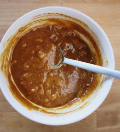 - Schenk de sojasaus in een kom en voeg meteen al roerend de knoflook toe. Giet daarna alle droge ingrediënten in een homogene massa en giet er een beetje plantaardige olie in. Mix alles grondig tot een glad geheel.
