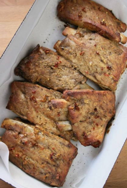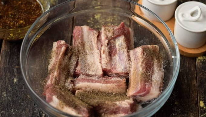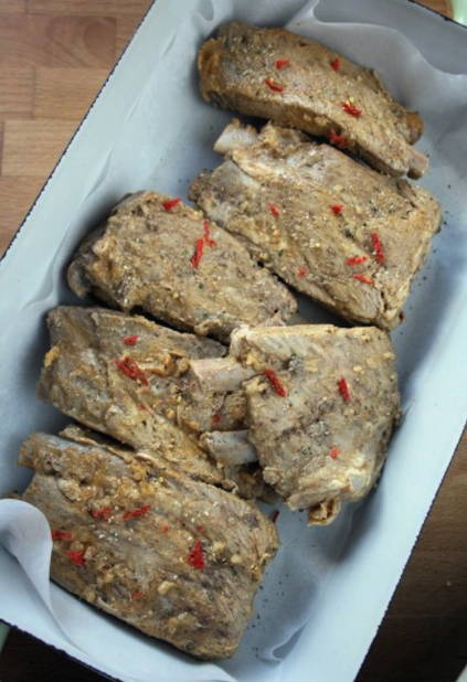 - Naast de marinade malen we de chilipeper, strooien we deze apart over de gekookte varkensribbetjes en bestrijken ze pas met mosterdmarinade. En laat de spareribs minimaal 12 uur marineren.