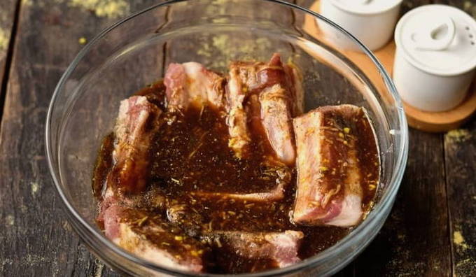 - Daarna brengen we de voorbereide varkensribbetjes over in een diepe container en vullen ze met de huidige marinade. We proberen het vlees van alle kanten volledig te bedekken met een pittige marinade en pas daarna laten we het minimaal twee uur afkoelen.