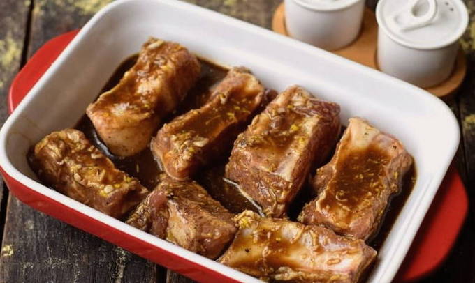- Meng alle inhoud grondig zodat de varkensribbetjes volledig bedekt zijn met de afgewerkte marinade. Daarna verplaatsen we ze minimaal 2 uur naar de koelkast, zodat het vlees de tijd heeft om verzadigd te raken met aroma's, zacht en zo verzadigd mogelijk te worden.