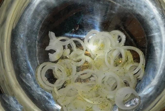 - Snijd de gepelde uien in ringen en doe ze in een diepe bak, voeg dan naar smaak kruiden en zout toe.