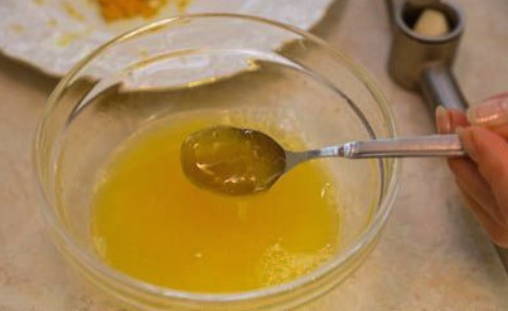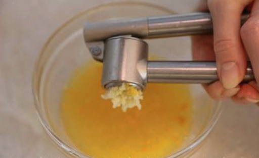 - Pers in dezelfde container met sap en honing de gepelde teentjes knoflook uit. Mix het mengsel goed tot een glad beslag.
