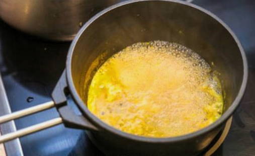 - Giet de volgende vloeibare ingrediënten in een homogene massa en roer de inhoud opnieuw.