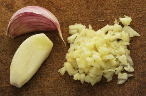 Pel de knoflook en hak de teentjes met een mes zo klein mogelijk.