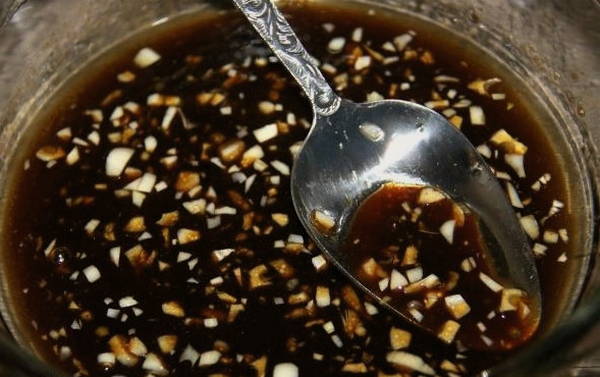- Voeg de gehakte knoflook toe aan de totale massa en meng voor de laatste keer alle componenten voor de marinade grondig.