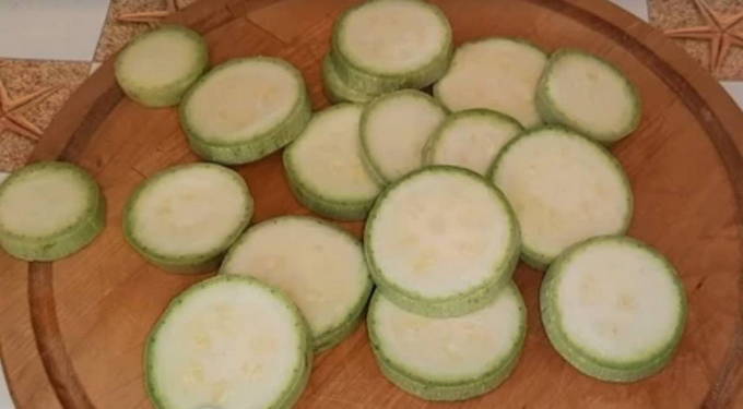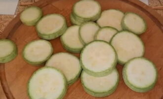 - Spoel de courgette goed af onder stromend water, droog hem af en snij in dunne ringen, niet dikker dan 5-7 millimeter.