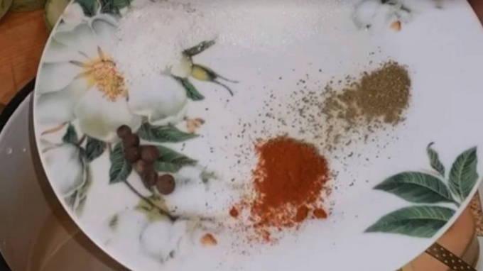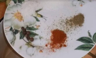 Laten we voor de marinade zorgen. Giet een glas water in een pan en voeg daar de kristalsuiker, zout, laurierblad, paprika en twee soorten peper toe.