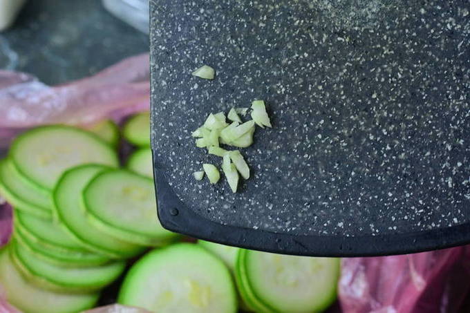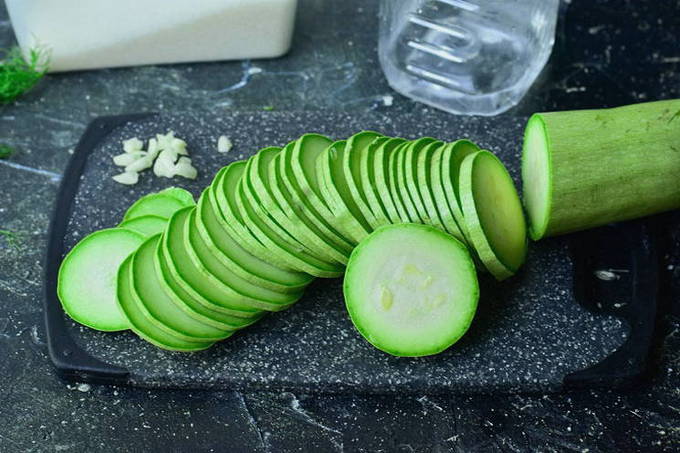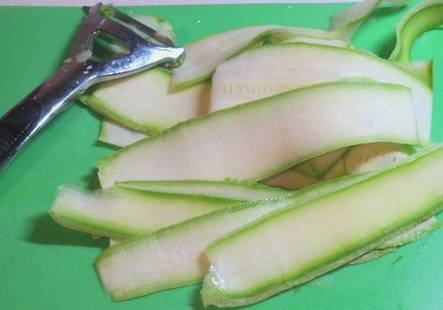 - Snijd schone en gedroogde courgette in dunne plakjes (het wordt aanbevolen om een dunschiller te gebruiken om tijd te besparen).