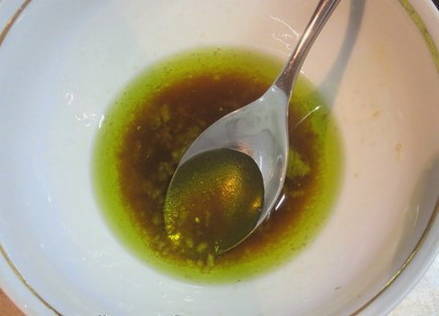 - Combineer knoflook in een kleine kom die door een pers is gehaald, olijfolie, azijn en honing gesmolten in een magnetron.
