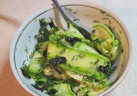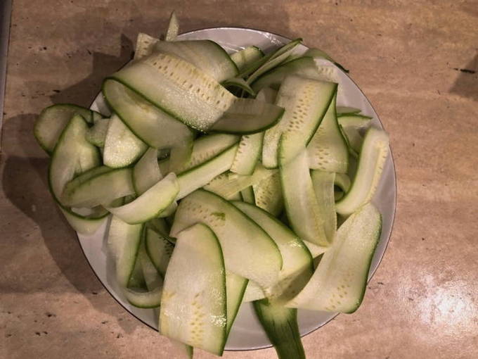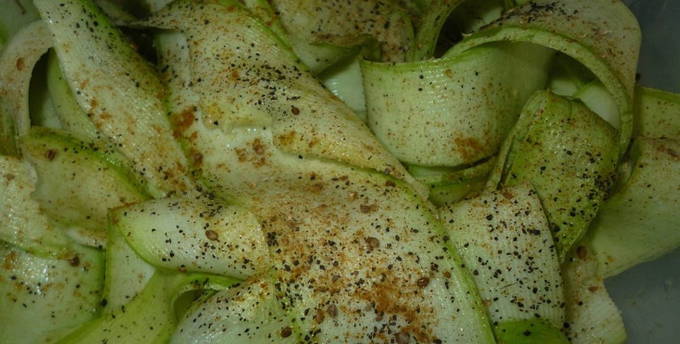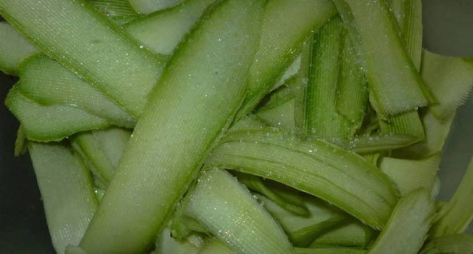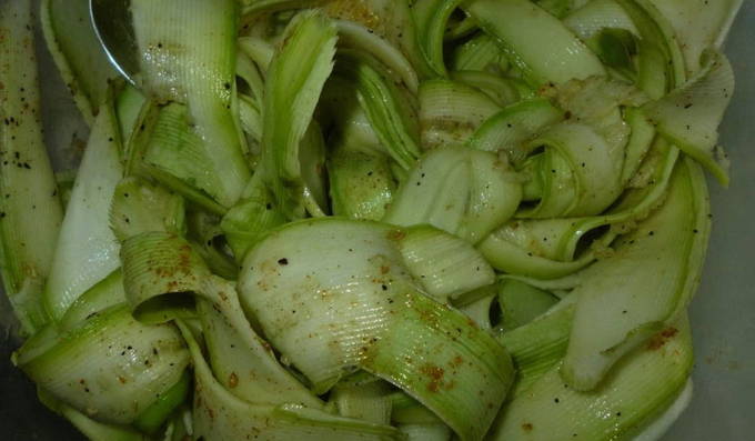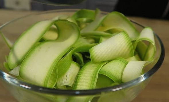 - Snijd schone courgette in dunne plakjes met een dunschiller, bedek met zout en laat een half uur staan.