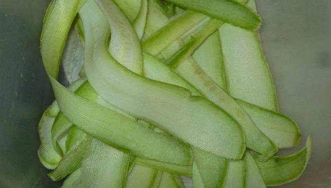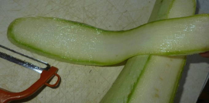 - Snijd "melk" courgette in de dunst mogelijke plakjes. Een dunschiller doet uitstekend werk met deze taak.