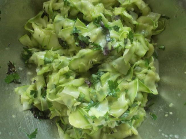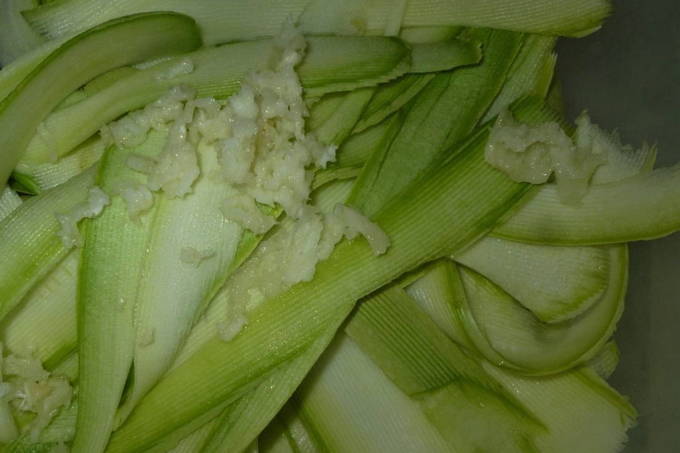 - Knijp de gezouten courgetteplakken voorzichtig uit het overtollige sap en stuur ze naar een geurige dressing - roer. We zetten het voorgerecht 5-8 uur op een koele plaats om te weken (het wordt aanbevolen om tijdens het marineren meerdere keren te mengen).