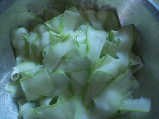 - Snijd de courgette met een dunschiller in zeer dunne plakjes.
