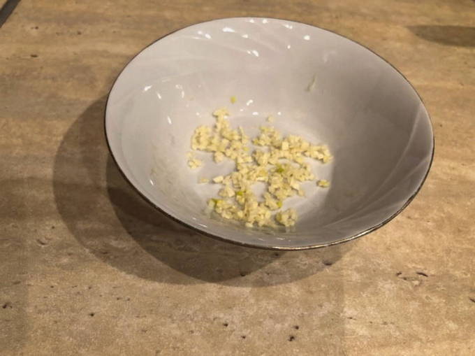 - 4 teentjes knoflook worden "bevrijd" van de schil en fijngehakt of door een breker gehaald.