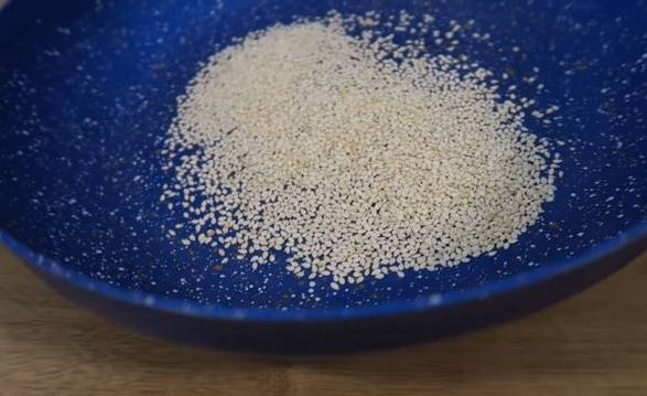 - Bak eerst de sesamzaadjes goudbruin in een droge koekenpan (zonder olie toe te voegen).