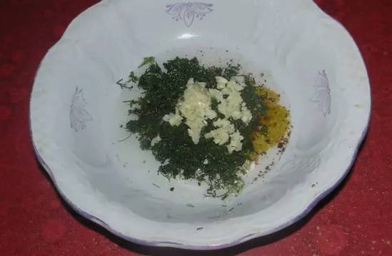 - Laten we een tankstation voorbereiden. Meng in een diepe bak plantaardige olie, gehakte knoflook, gemalen peper, dille en je favoriete kruiden indien gewenst.