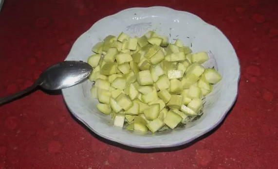 - Doe de afgekoelde courgetteblokjes in het resulterende mengsel.