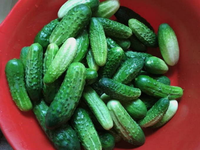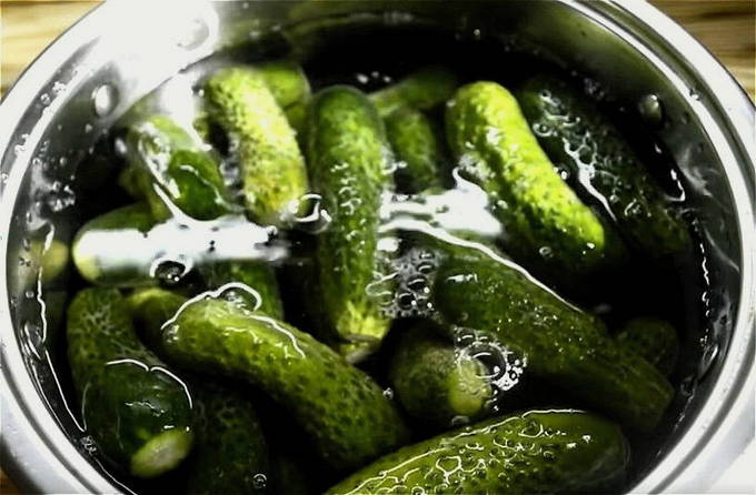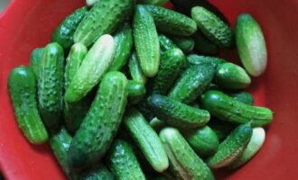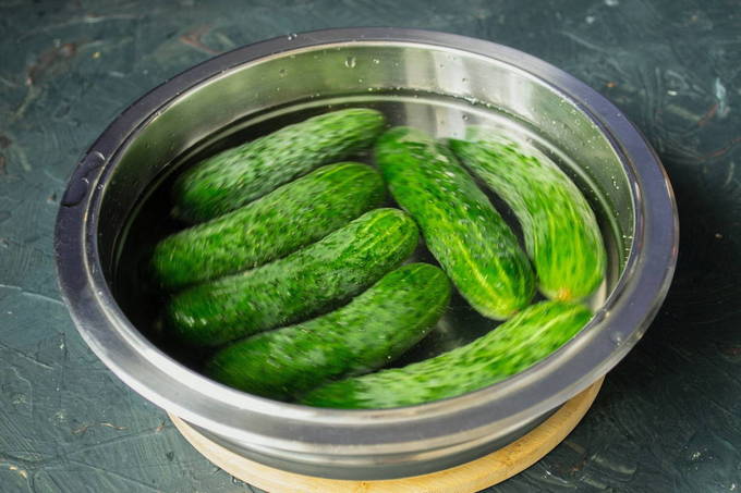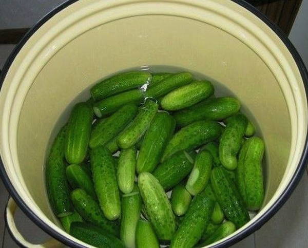 - We wassen de kleine komkommers in een stroom water en doen ze in een grote bak - een kom of een pan. Giet in koud water en laat 6 uur staan.
