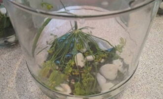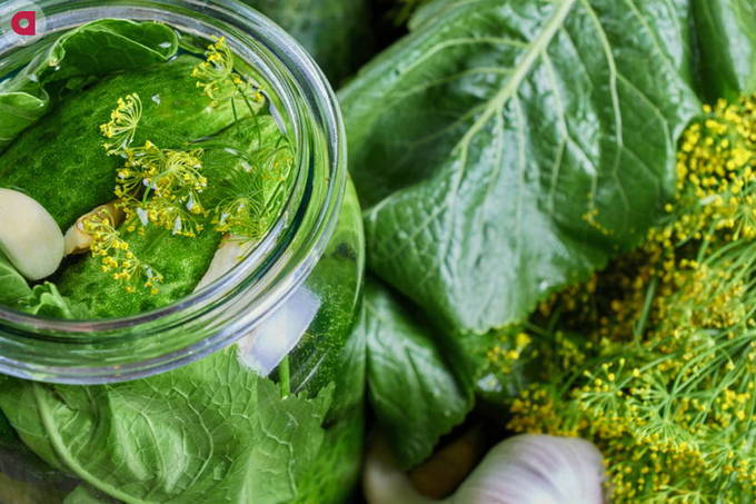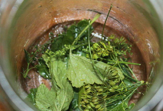 - Doe zuiveringszout op een spons en maak de komkommerrolcontainer schoon. We wassen de pot en het deksel grondig. Laat het drogen. We wassen de bladeren van dille, mierikswortel, laurier en aalbes. We pellen de knoflookteentjes van de schil. We zetten de ingrediënten op de bodem van de pot.