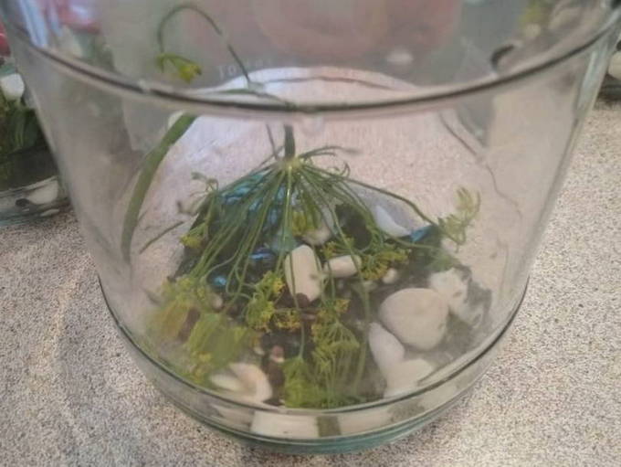 - We zetten een bak met water op de brander. Zet het vuur aan en breng de vloeistof aan de kook. Voeg peper, kruidnagel en dille toe aan de potten. Vul de inhoud van de potten met kokend water. We vertrekken voor 10 minuten.