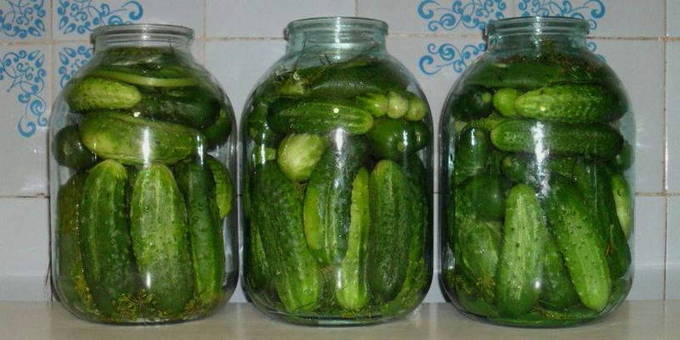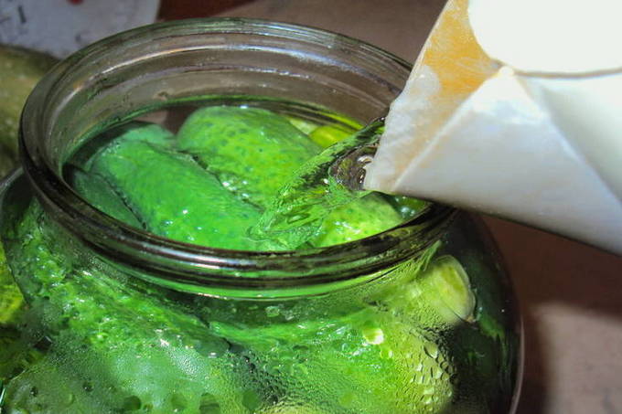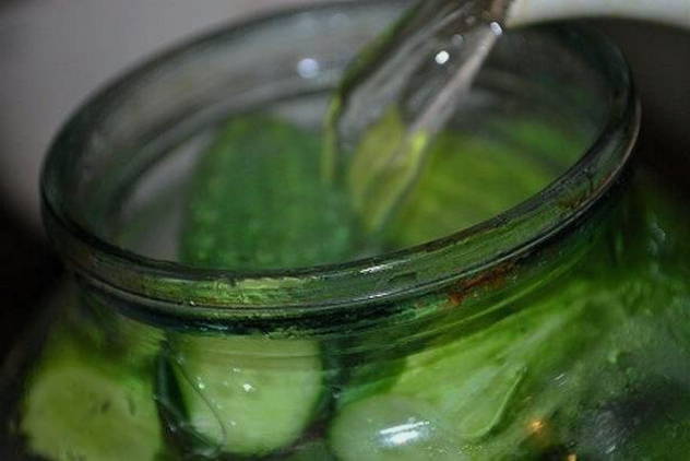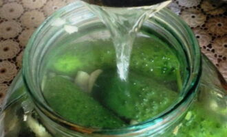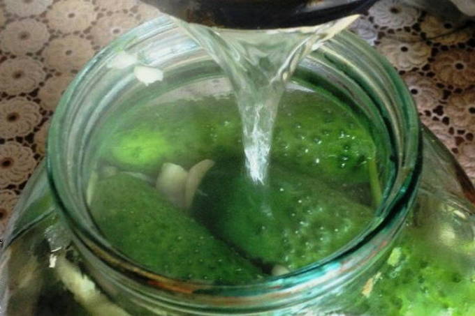 - We zetten een pan water op de brander. We zetten het fornuis aan en koken de vloeistof. Giet kokend water in een pot komkommers. We vertrekken voor 15 minuten. Giet vervolgens de vloeistof in de gootsteen. We herhalen de procedure nog 2 keer.