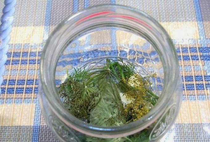 - Terwijl de komkommers weken, steriliseren we de pot en het deksel voor toekomstige naden. Dit doen we in de oven. Doe piment in de afgewerkte container. Spoel de dilleparaplu af en dep hem lichtjes met keukenpapier. We zetten het op de bodem van het blik. Scheid twee teentjes knoflook van de kop en pel ze. We doen de knoflook in een pot.