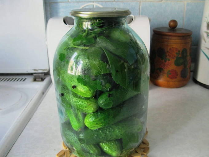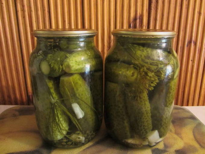 - Ingelegde komkommers zonder sterilisatie in een pot van 1,5 liter