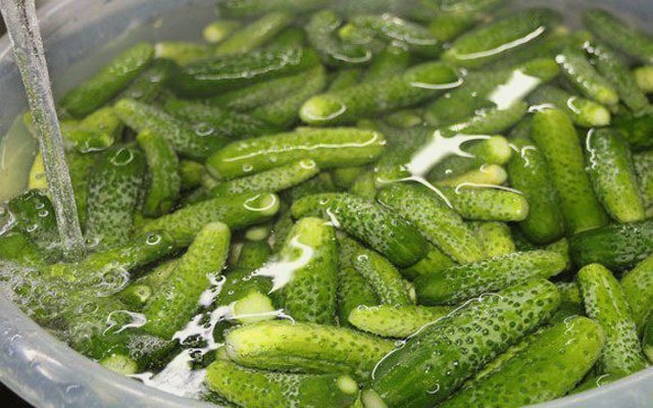 We nemen een grote bak en gieten er koud water in. Leg de komkommers in het water en laat ze 1-2 uur weken. Spoel na de toegewezen tijd elke komkommer onder stromend water.
