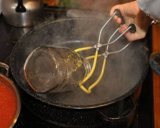 - We bekleden de bodem van de pan met een servet of handdoek. We zetten het op het fornuis. Plaats een pot met de inhoud in de pan en giet water tot het niveau van de "schouders" van de container. We zetten de techniek aan en brengen het water aan de kook. We maken het vuur minder en laten de pot samen met de inhoud 15 minuten steriliseren. We rollen de pot op en draaien het deksel naar beneden. We zetten de container op een geschikte plaats om te koelen. Dan bewaren we het in de voorraadkast.