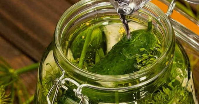 - We herhalen dezelfde manipulaties als in de vorige stap. Als het water kookt, haal je de pan eruit en voeg je de azijn toe. Zet het fornuis uit. Roer de inhoud van de pan om. Giet de marinade over de komkommers in de pot. Dek af en rol op. Laat de naad afkoelen.