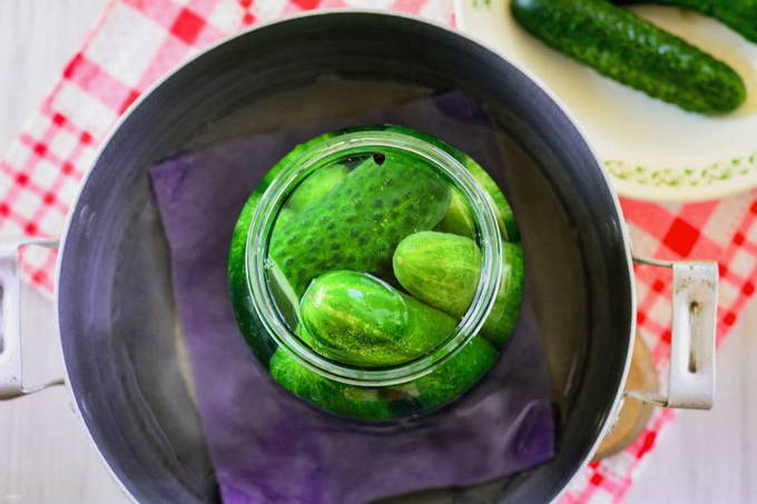 - Voor de pekel filteren we vooraf de benodigde hoeveelheid water. Vul komkommers in potten met schoon koud water. Plaats de containers op de bodem van een grote pan bekleed met een handdoek. Giet water in een pan. We zetten het fornuis aan en brengen het water aan de kook. We koken de potten met de inhoud niet langer dan twee minuten. Haal de pan van het vuur en zet het vuur uit.