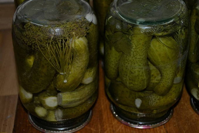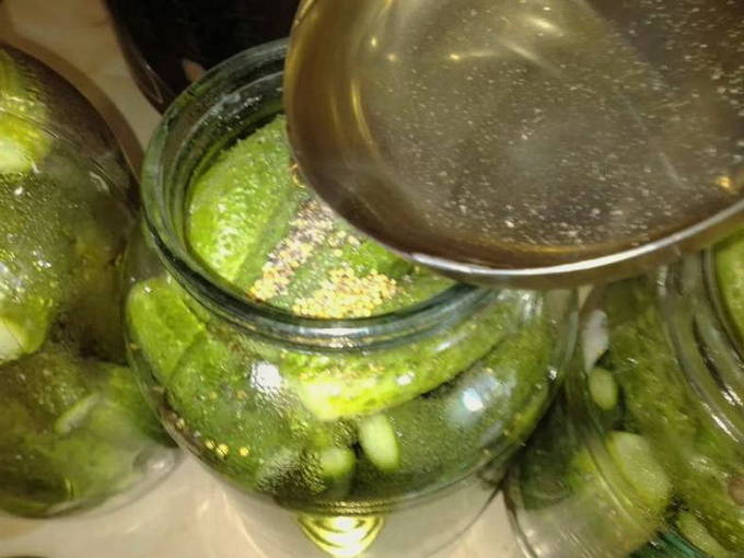 - Doe mosterd en peterselie op de komkommers. We zetten een pot water op het fornuis en zetten de techniek aan. Breng de vloeistof aan de kook en giet het in een bak met komkommers. We schroeven de deksels licht op de potten en laten 15 minuten staan.