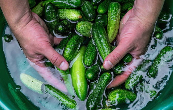 - We wassen de komkommers en leggen ze meteen één voor één in een grote bak. Vul de komkommers met koud water en laat een paar uur staan.