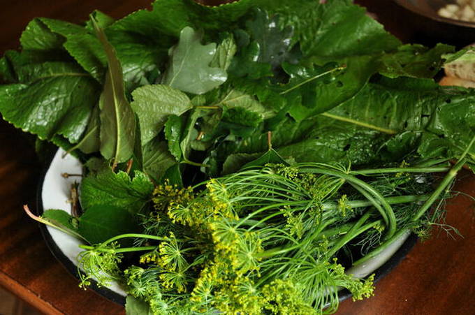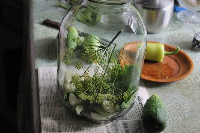 - We wachten tot de potten en deksels droog zijn. We wassen de mierikswortelbladeren en dille met koud water, drogen ze een beetje, verspreiden de mierikswortelbladeren op de bodem van de blikken. Vervolgens leggen we de komkommers zo strak mogelijk tegen elkaar.