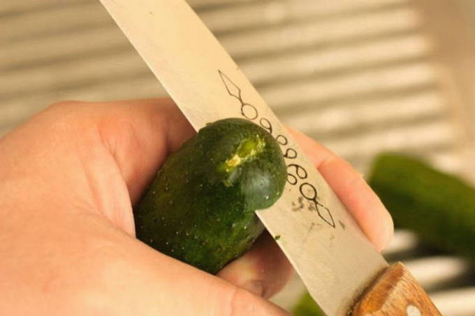 - We wassen verse komkommers. Voor het naaien is het het beste om vruchten te kiezen die klein, sterk en veerkrachtig zijn. We doen ze in een bak en vullen ze met koud water. We vertrekken voor 3 uur. Na een tijdje halen we de komkommers uit het bekken en snijden de uiteinden van de vruchten aan beide kanten af.