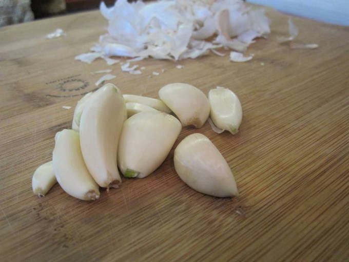 - Pel de knoflookteentjes en snijd ze in dunne plakjes. Nu nemen we blikken en deksels en controleren ze op scheuren en schilfers. We steriliseren de container met deksels. Doe de groenten in schone potten: dille, krentenblaadjes en mierikswortel.