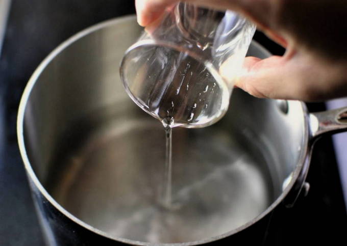 - Laten we nu het mengsel voor de mortel voorbereiden. Giet opnieuw water in de pot. We zetten de container op het kookfornuis. Zodra het water kookt, voeg je zout en suiker toe aan de vloeistof. Voeg als de ingrediënten zijn opgelost het laurierblad en beide soorten peper toe. Bij het opnieuw koken beginnen we geleidelijk azijn in de vloeistof te gieten. Tegelijkertijd roeren we de oplossing constant.