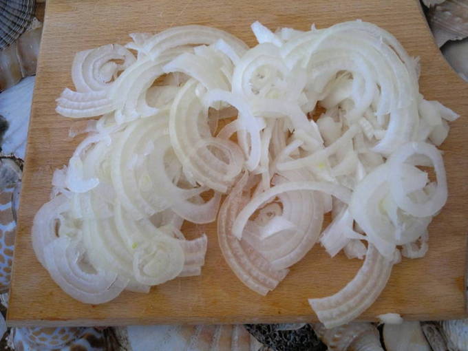 - Pel de ui. Spoel het licht af en snijd het langs de kop in tweeën. Daarna snijden we elk deel in halve ringen.