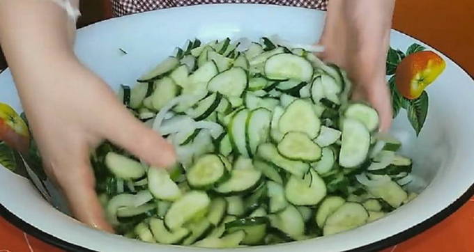 - We nemen een grote bak en leggen er plakjes komkommer en uien in. Giet er zout, suiker, peper in. Laurierblaadjes, olie en azijn toevoegen. Roer en laat een paar uur staan.