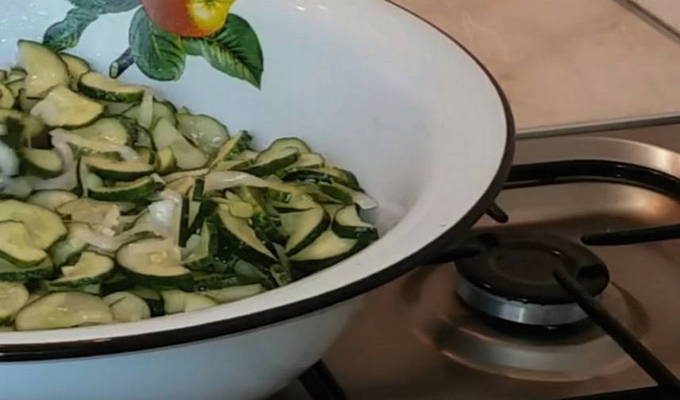 - Zet na 2 uur de kom met komkommers en andere ingrediënten op de brander. Zet het fornuis aan en kook het mengsel tot de plakjes komkommer van kleur veranderen. We brengen het mengsel over naar de pot.