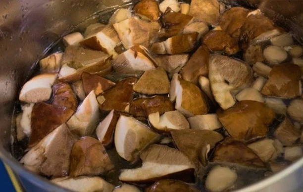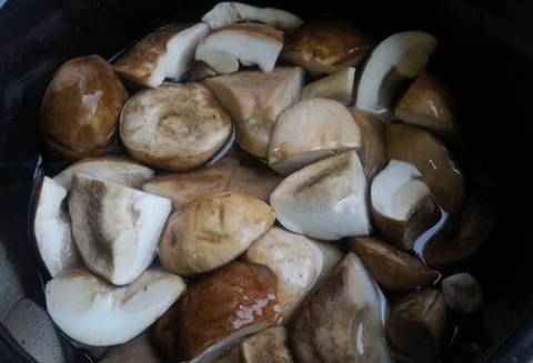 - Sorteer verse boletuspaddestoelen, schil en spoel onder stromend water. Snijd desgewenst grote champignons in plakjes. Doe ze vervolgens in een diepe pan, bedek ze met koud water en zet op hoog vuur.