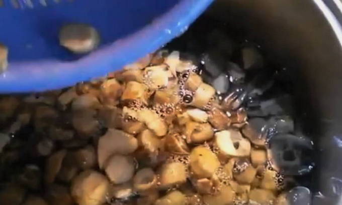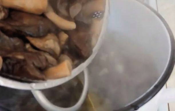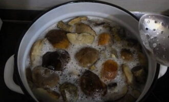 - Kook de boletus boletus in gezouten water gedurende 30 minuten en verwijder het schuim van het bouillonoppervlak. Gooi de gekookte boletus in een vergiet en spoel af met koud water. Als je voor de eerste keer kookt, kun je een snufje citroenzuur aan de champignons toevoegen zodat ze niet donker worden. Weeg de gekookte champignons.